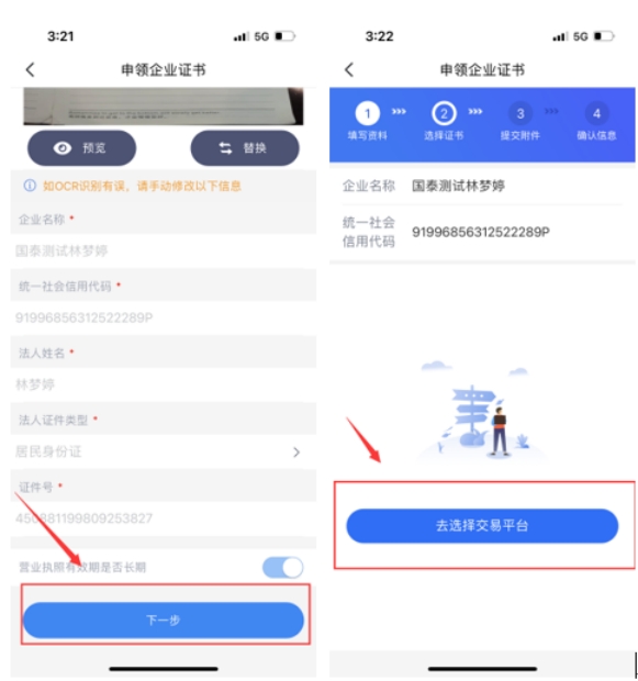 三、填写完标红必填项信息后点击【下一步】,选择交易平台;