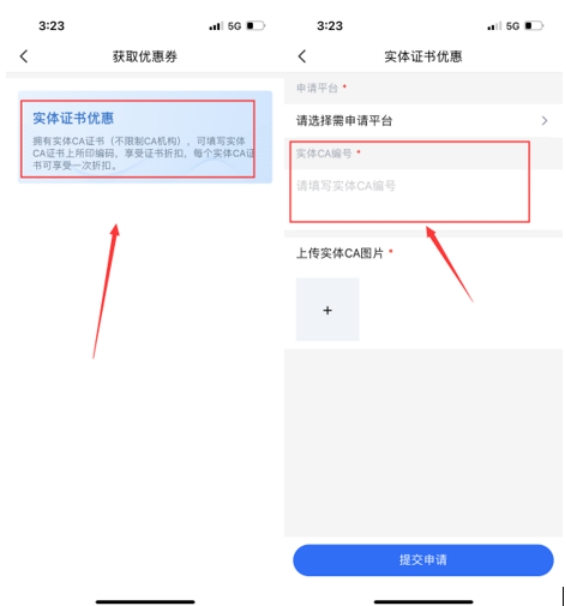 五、进入到领取优惠券页面,点击【实体证书优惠】,填写标红必填项;