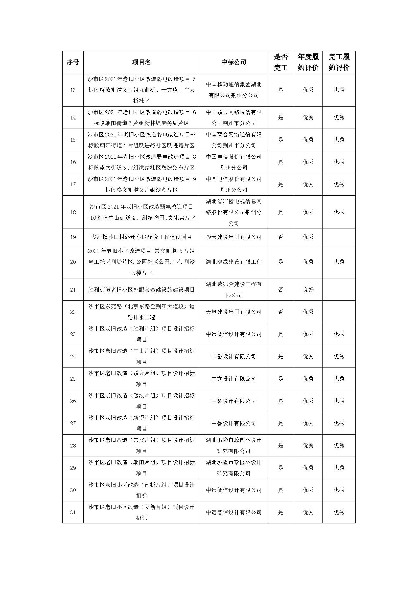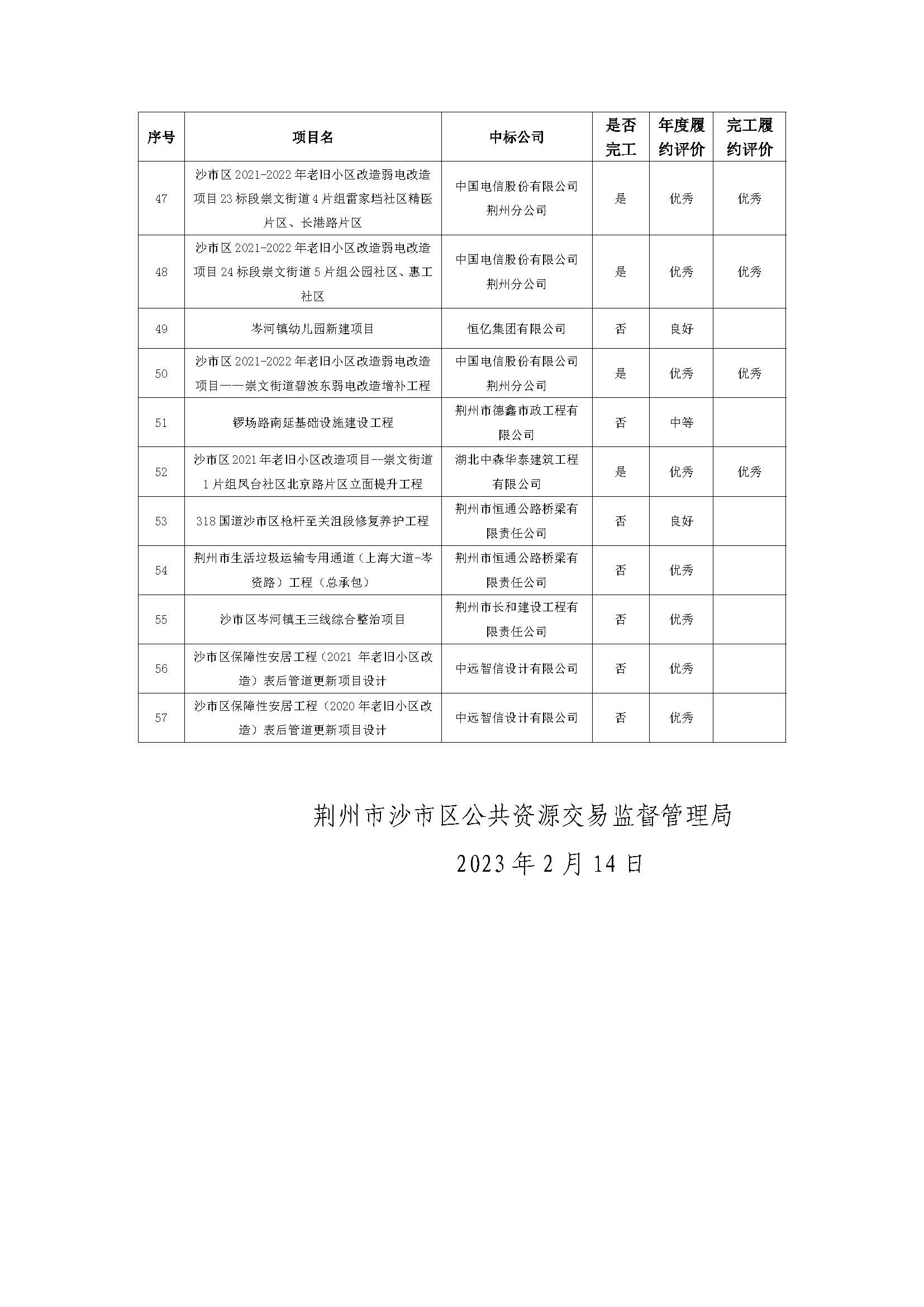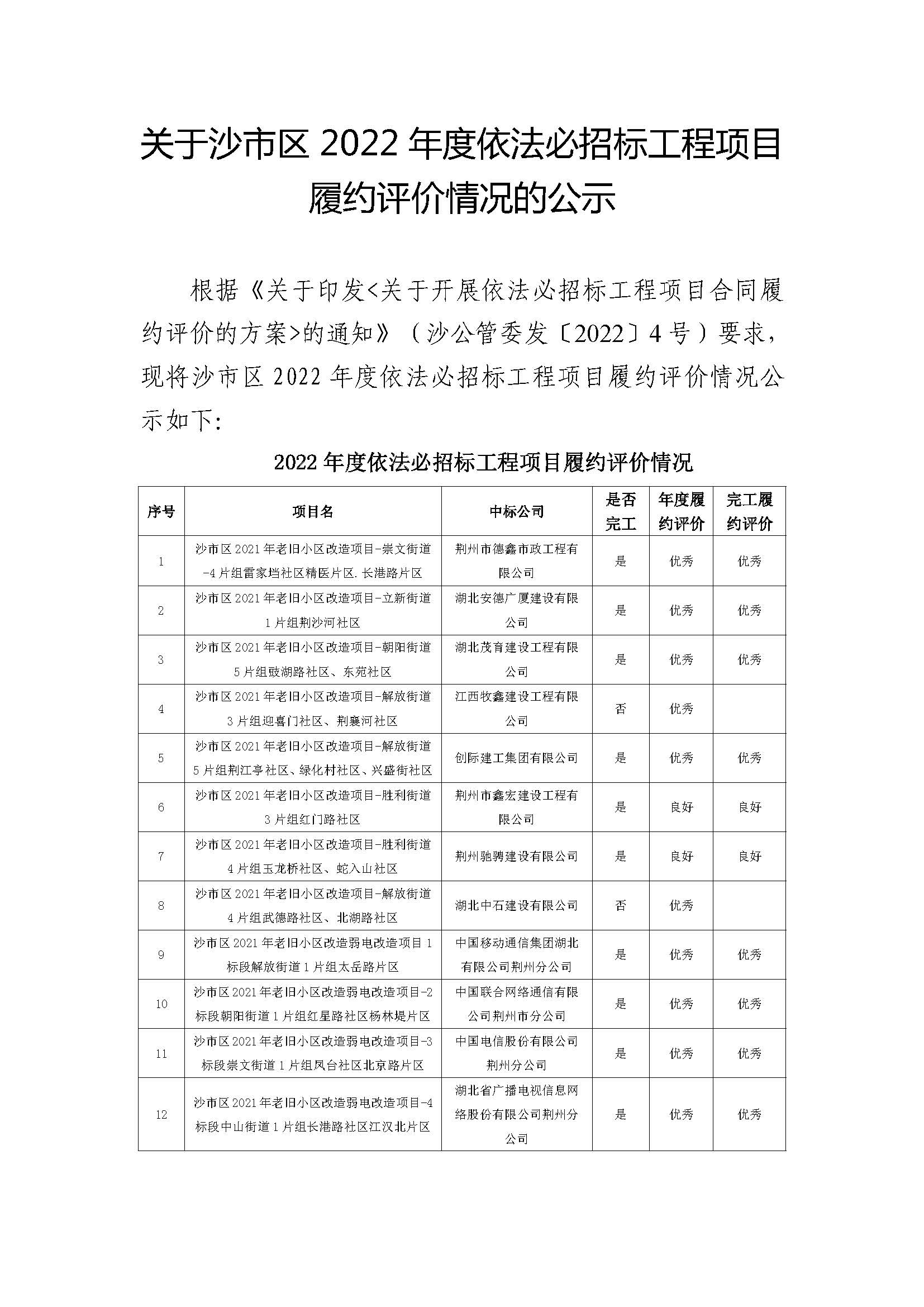 关于沙市区2022年度依法必招标工程项目履约评价结果的公示