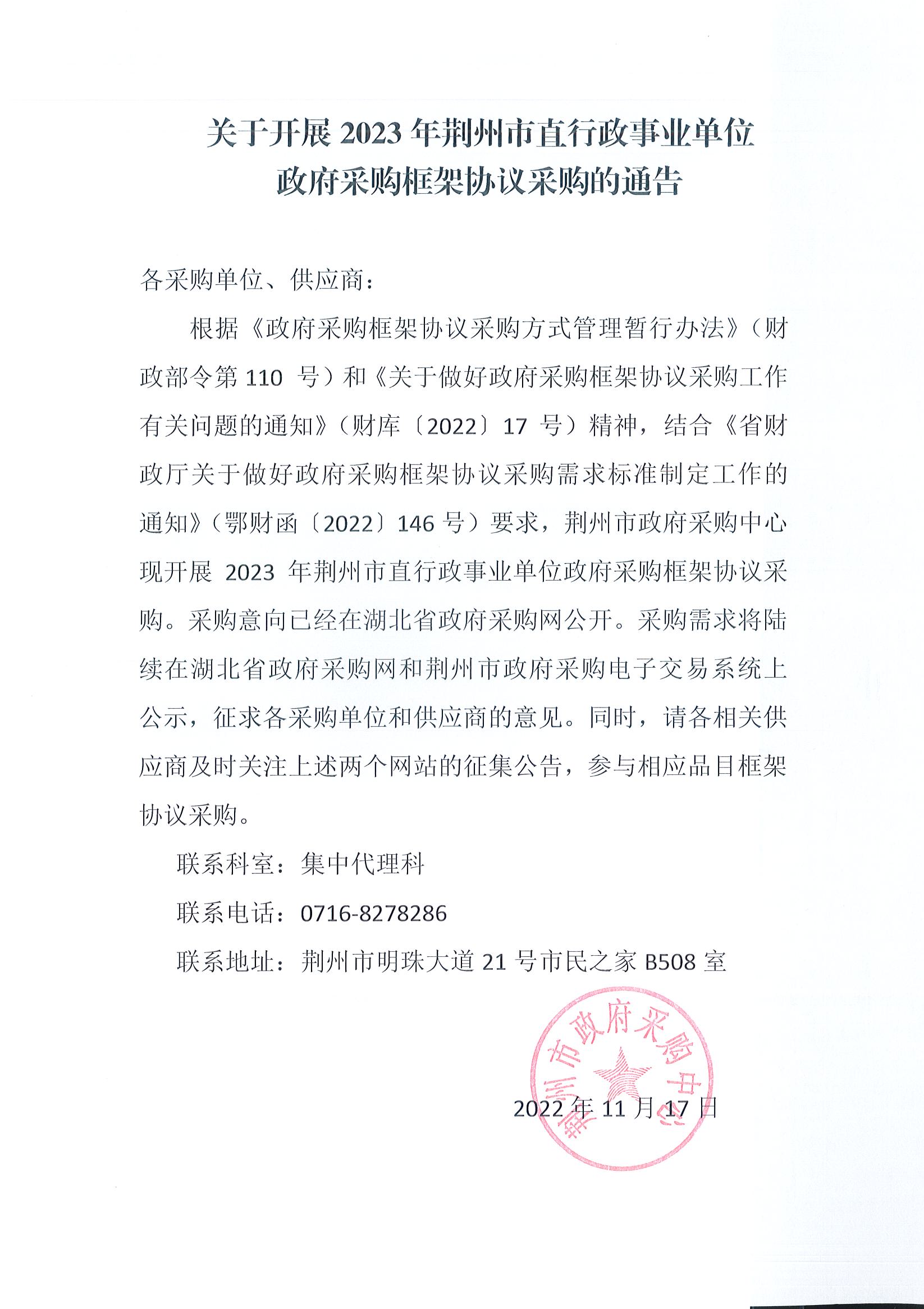 关于开展2023年荆州市直行政事业单位政府采购框架协议采购的通告