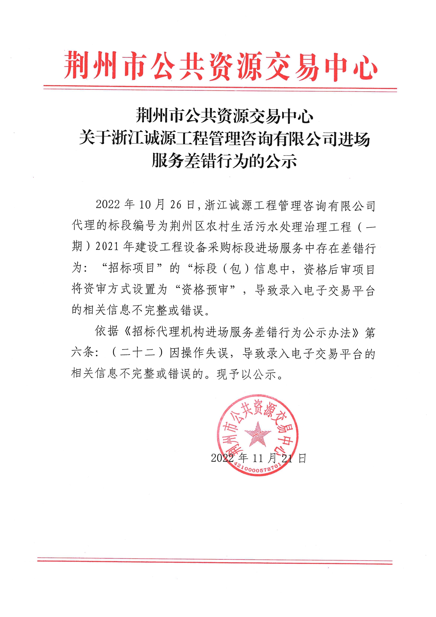 关于浙江诚源工程管理咨询有限公司进场服务差错行为的公示