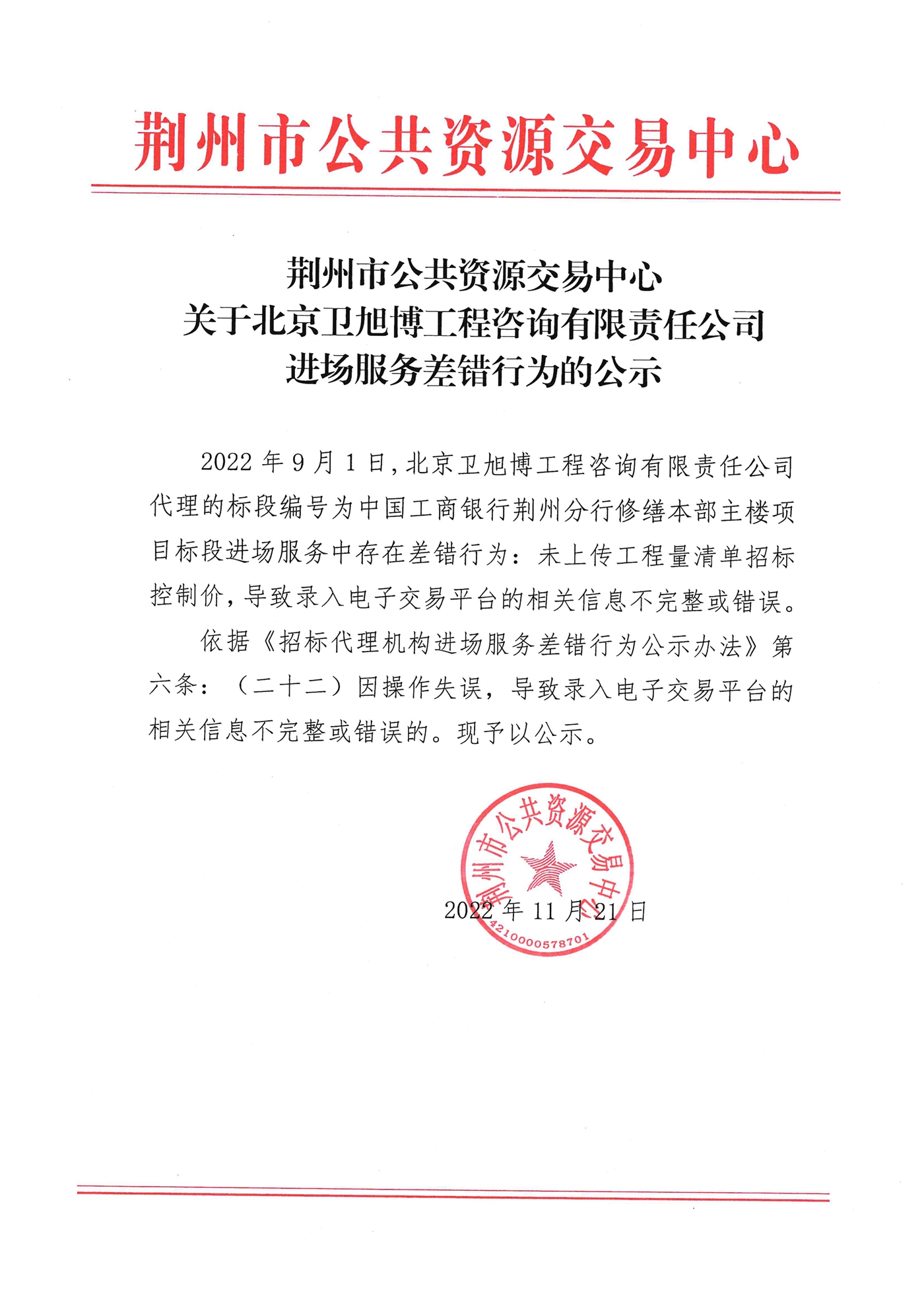 关于北京卫旭博工程咨询有限责任公司进场服务差错行为的公示
