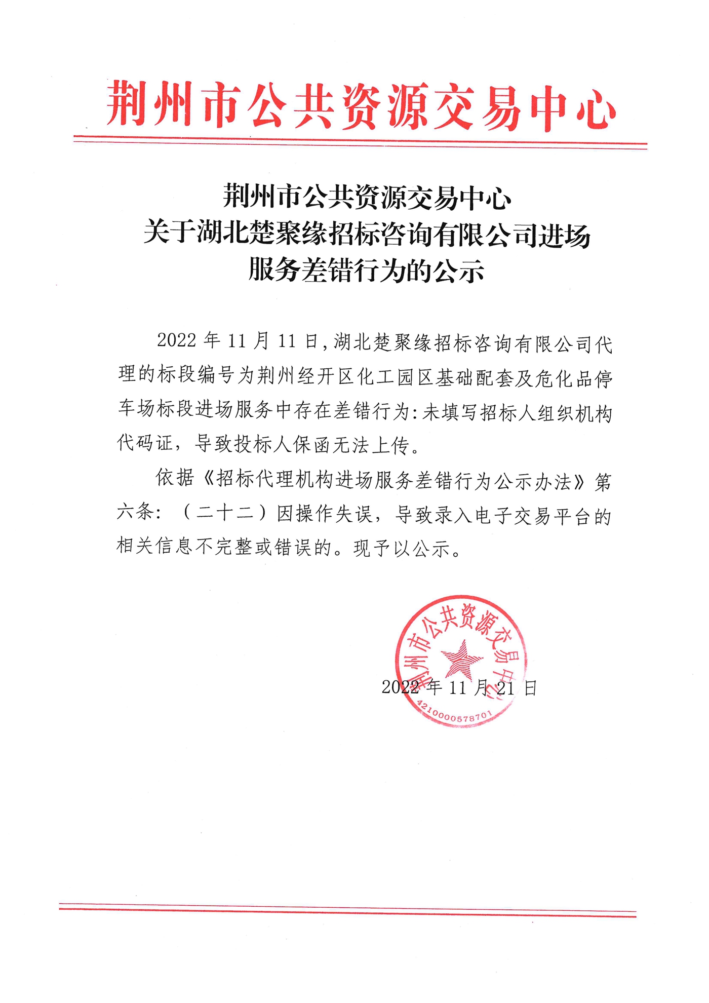关于湖北楚聚缘招标咨询有限公司进场服务差错行为的公示