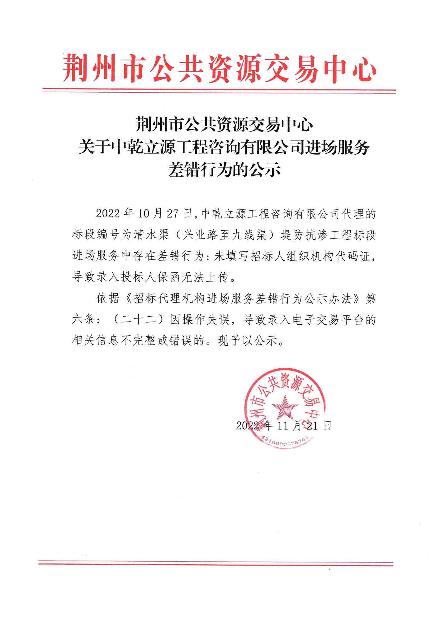 关于中乾立源工程咨询有限公司进场服务差错行为的公示