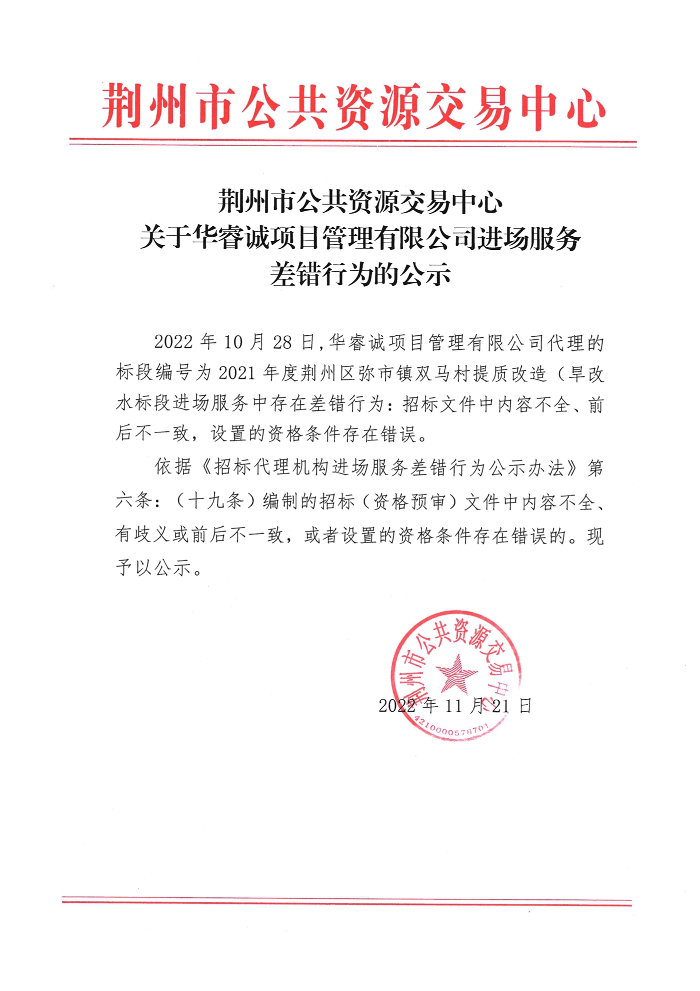 关于华睿诚项目管理有限公司进场服务差错行为的公示