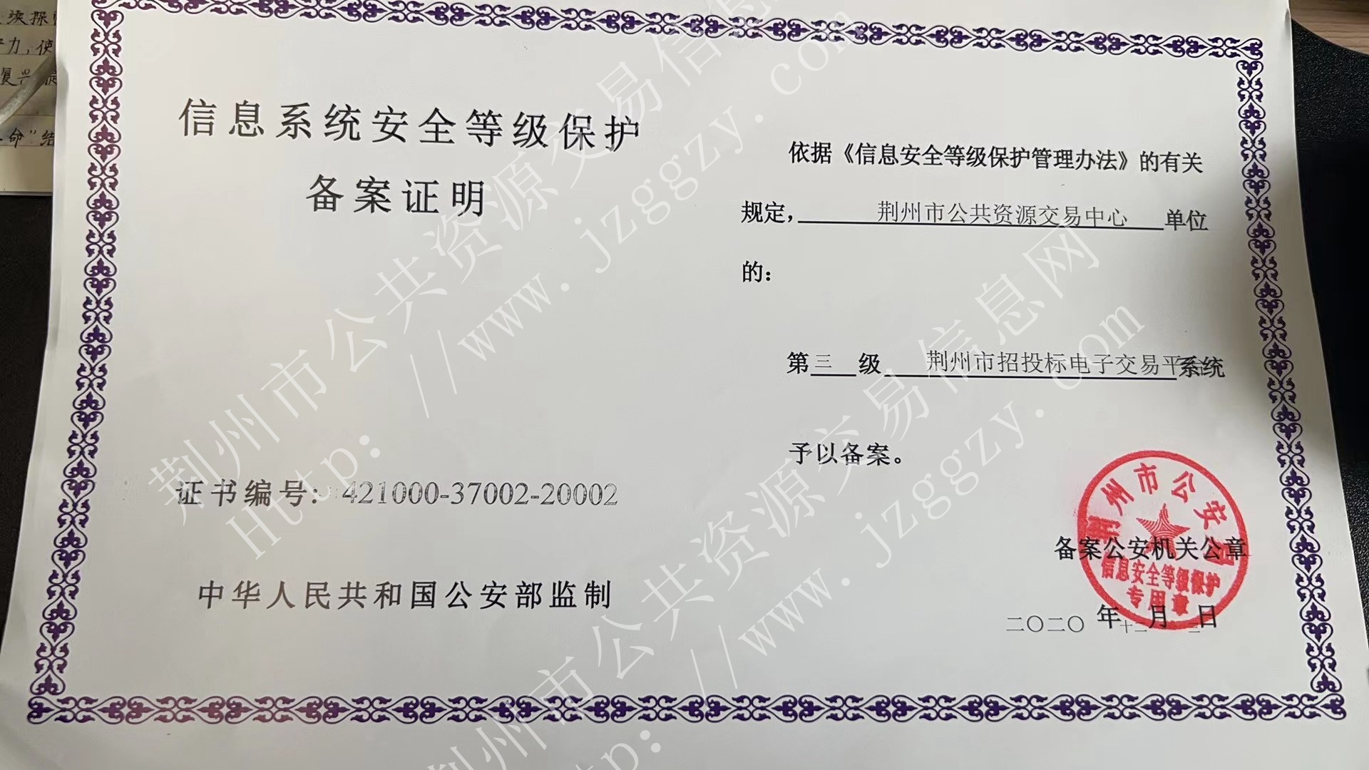 荆州市招投标电子交易平台信息系统-安全等级保护备案证明(421000-37003-20002)