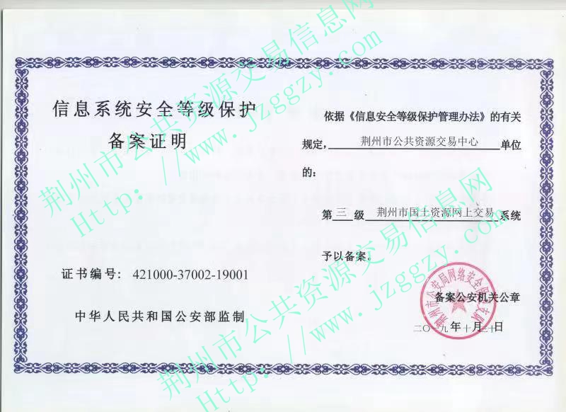 荆州市国土资源网上交易信息系统-安全等级保护备案证明(421000-37002-19001)