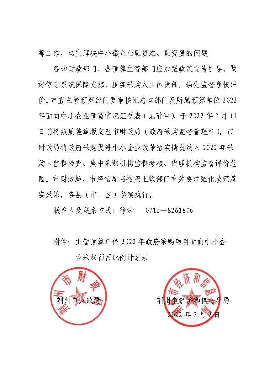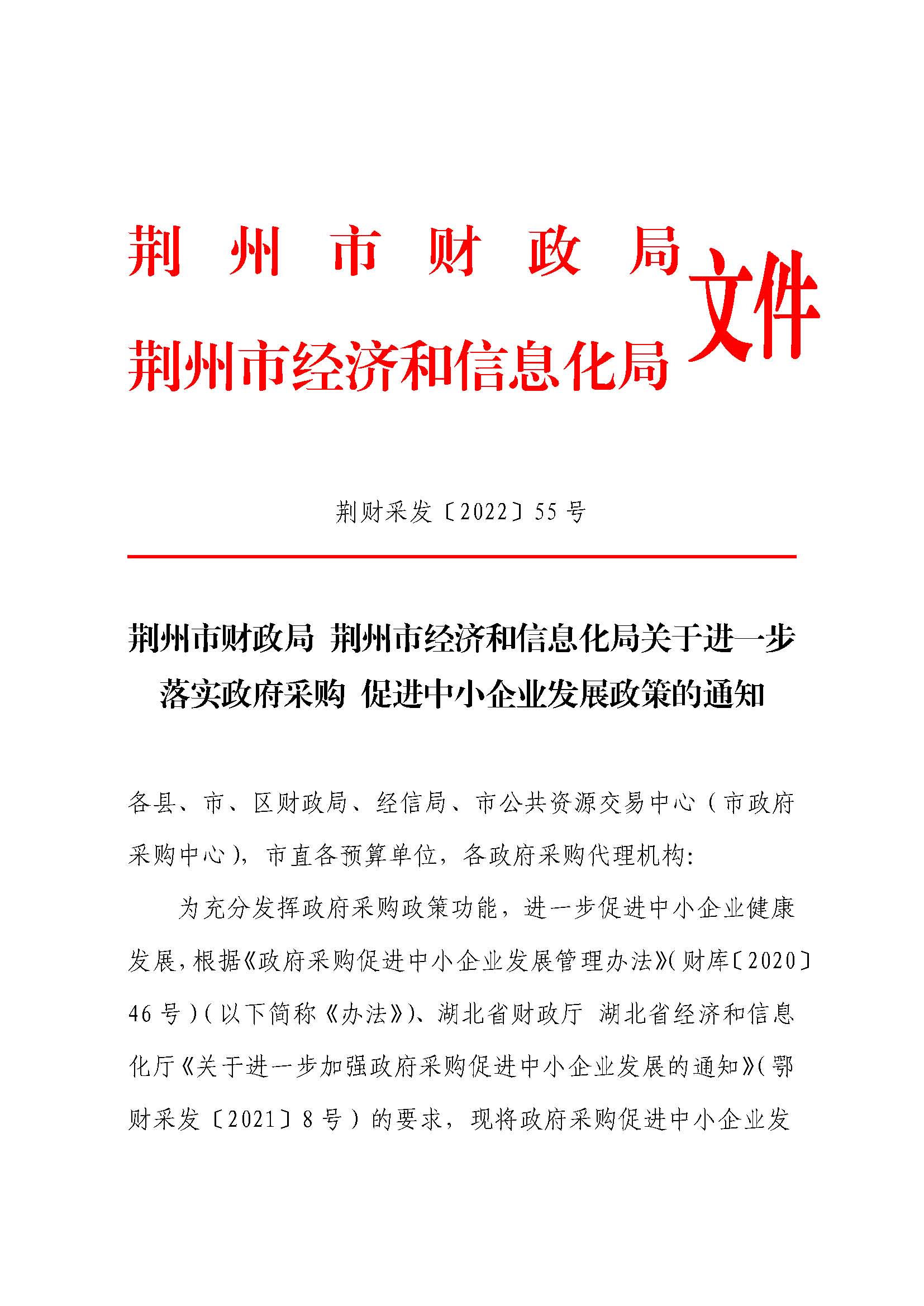 荆州市财政局 荆州市经济和信息化局关于进一步落实政府采购 促进中小企业发展政策的通知(荆财采发【2022】55号)